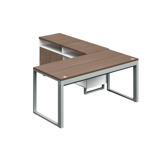 Descripción: Conjunto elaborado en melamina de 28mm de espesor, consta de escritorio, credenza baja con 2 entrepaños superiores, una puerta abatible, estructura rectangular 2×1 esmaltada en color gris, pasacables y niveladores de piso.