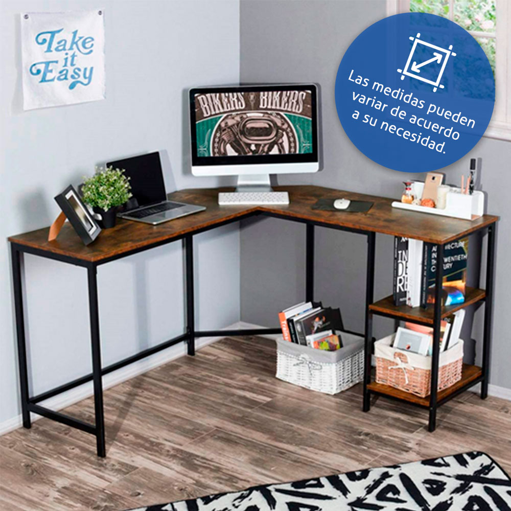Descripción: Escritorio en L con entrepaños, para ahorrar espacio, hecho en melamina con estructura cuadrada esmaltada en color a elegir. Las medidas pueden varias según sus necesidades.