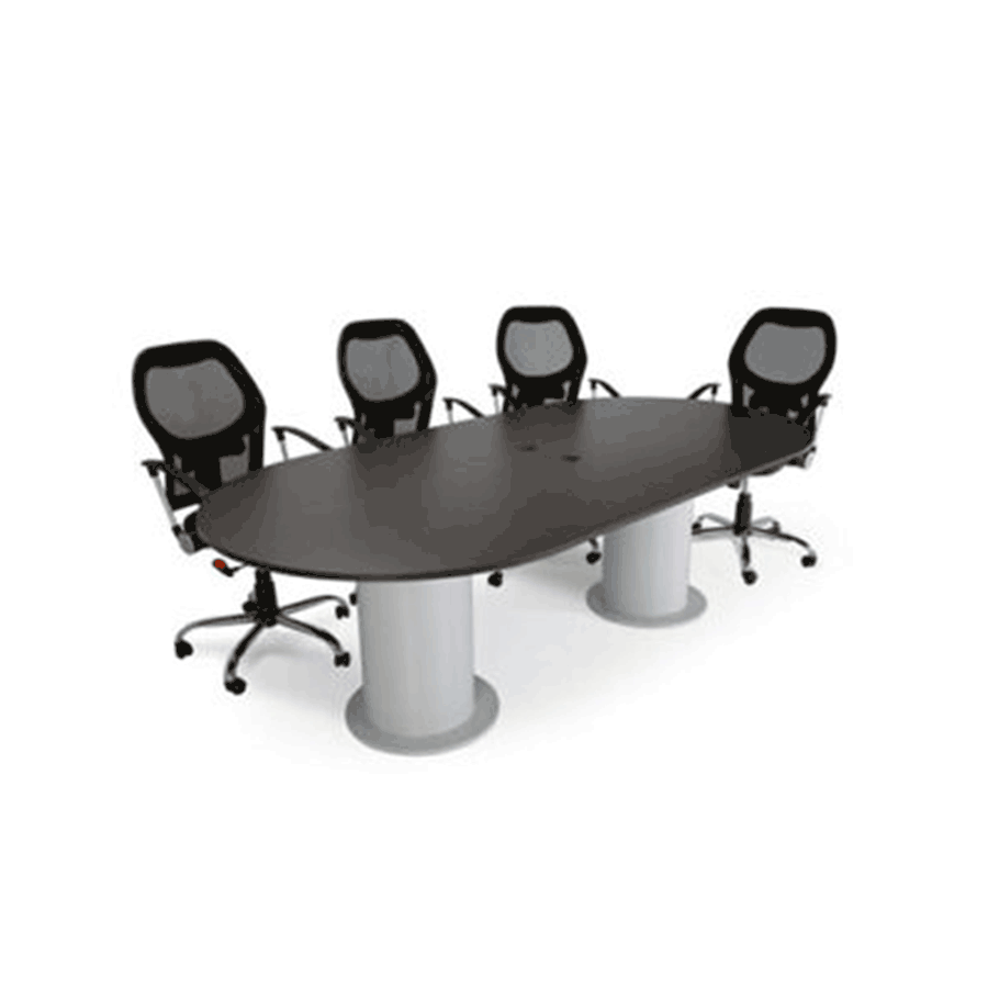 Mesa con cubierta ovalada y 2 bases cilíndricas, cubierta de melamina de 28 mm.
