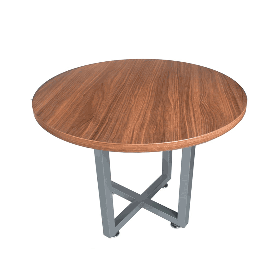Mesa de juntas con cubierta cuadrada o redonda en melamina, estructura metálica entrelazada de 3″x1″ tubular rectangular, con nivelador de altura ajustable. Medidas: 120 x 120 x 75 cm