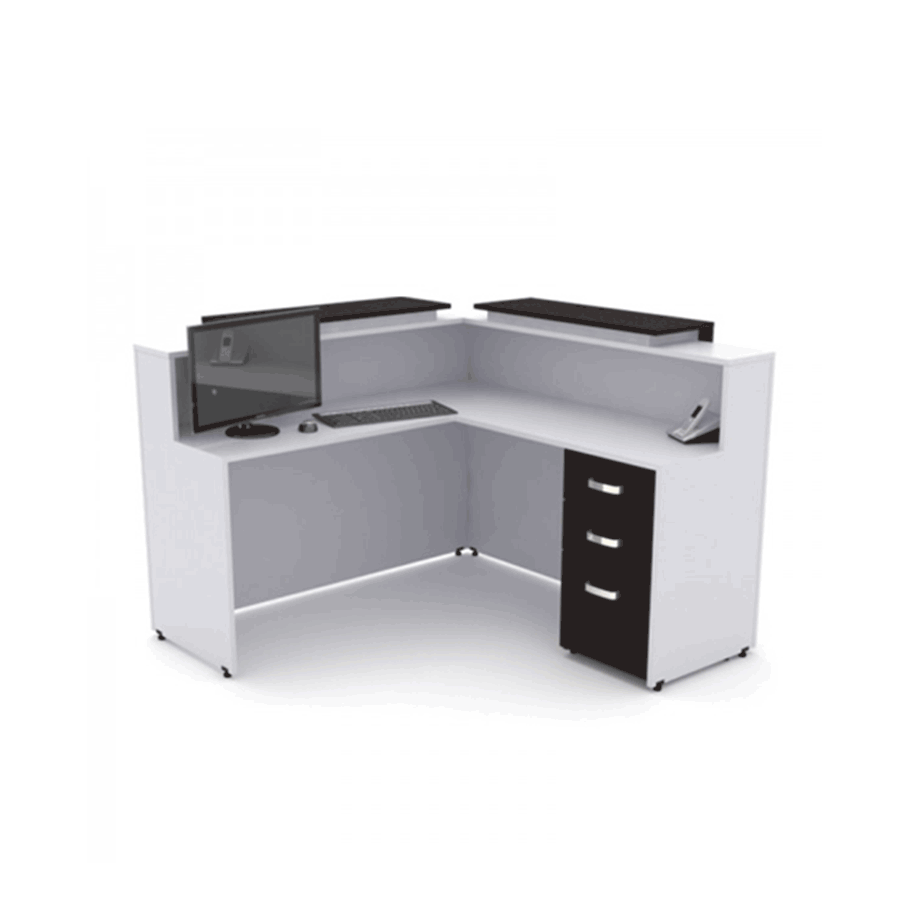 Recepción configurable con cubierta y base fabricada en melamina 19 mm de espesor, con acabado en los cantos en pvc de 1 mm y niveladores. Color a elegir. Medidas: frente 150cm x fondo 150cm x altura 103cm.
