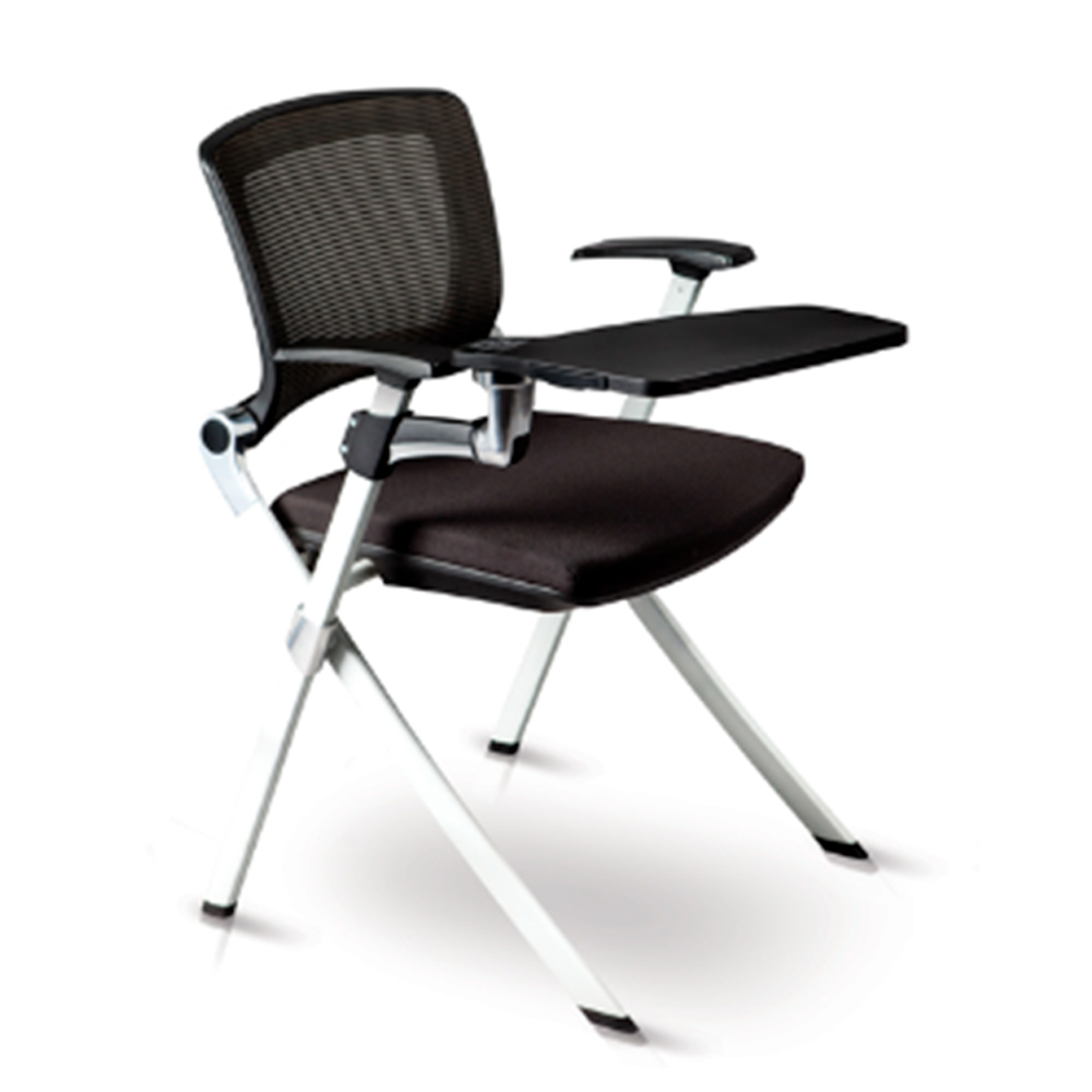 Silla con Respaldo ergonómico tapizado en malla negra. Asiento tapizado en tela negra. Estructura plegable con deslizadores o con rodajas