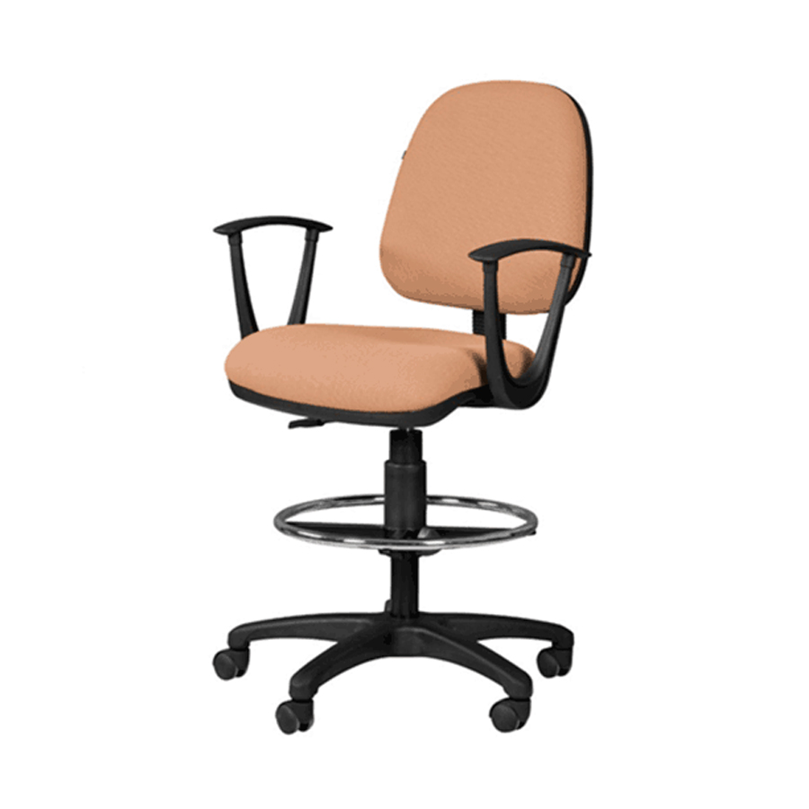 Descripción: Silla cajera tapizada en vinil o tela, color a elegir, descansa brazos. Base de 5 puntas en nylon reforzado, con y/o regatones, elevación por medio de pistón neumático. Descansa pies en cromo, opción nylon.
