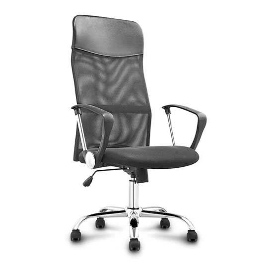 Descripción: Silla ejecutiva respaldo alto reclinable con marco metálico,  asiento tapizado en tela microespacial negra, cabecera tapizada en vinil. Brazos fijos de polipropileno con detalles cromados. Base de 5 puntas cromada con rodajas. Pistón neumática.