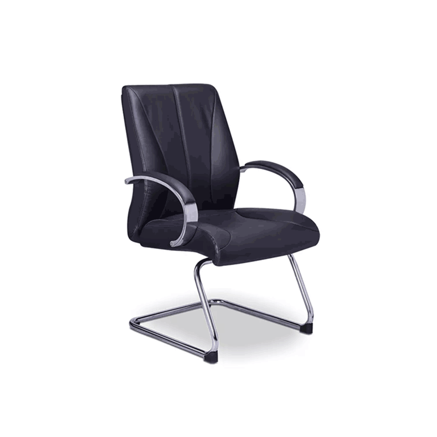 Sillón de visita en piel respaldo medio. Cuenta con base en trineo en acero tubular cromado. Su acojinamiento es en poliuretano inyectado de alta densidad con retardante al fuego y sus brazos son de aluminio pulido con codera acojinada.
